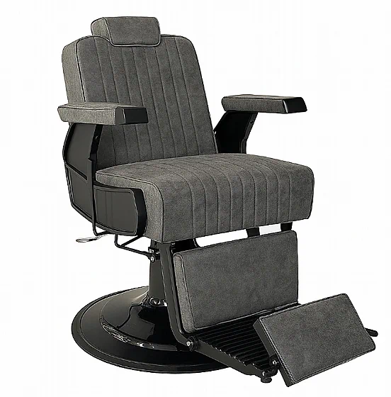 כיסא ברבר מקצועי בעיצוב מודרני עם ריפוד אפור קטיפתי ותפרים אנכיים. כולל מנגנון הטיית גב, סיבוב 360°, בוכנה הידראולית ומשענת ראש מתכווננת – לנוחות מרבית ומראה יוקרתי.